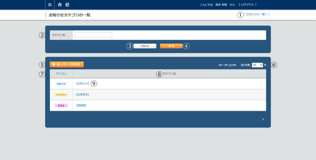 • メニューリスト>お知らせカテゴリ管理>カテゴリ名リンク