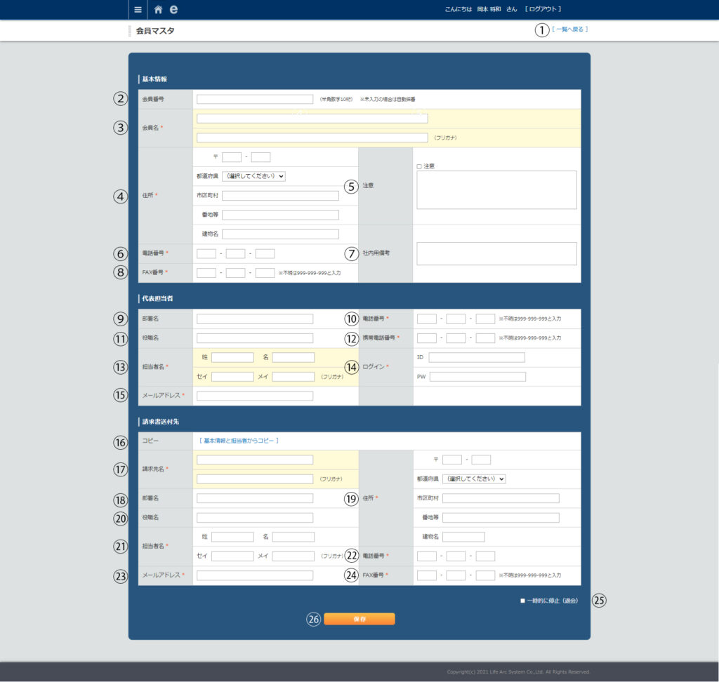 | ㉕ | 一時的に停止 | クリックで該当会員の利用(ログイン)を禁止することができます。 ※チェックを外すことで再度利用 (ログイン) できます。 |