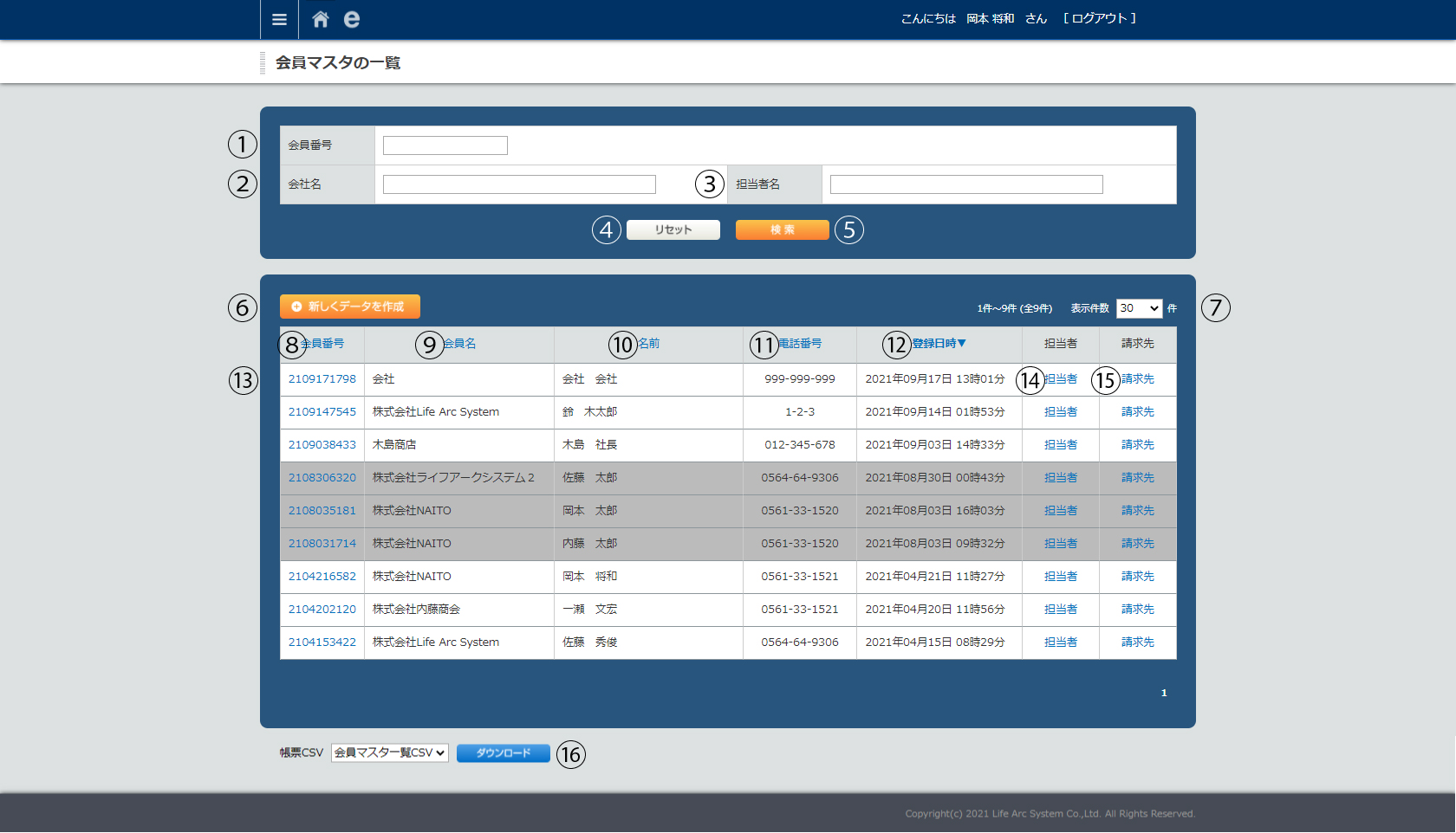 | ⑨ | 会員名 | 会員の会社名を表示しています。 クリックで数字順に降順/昇順します。 |