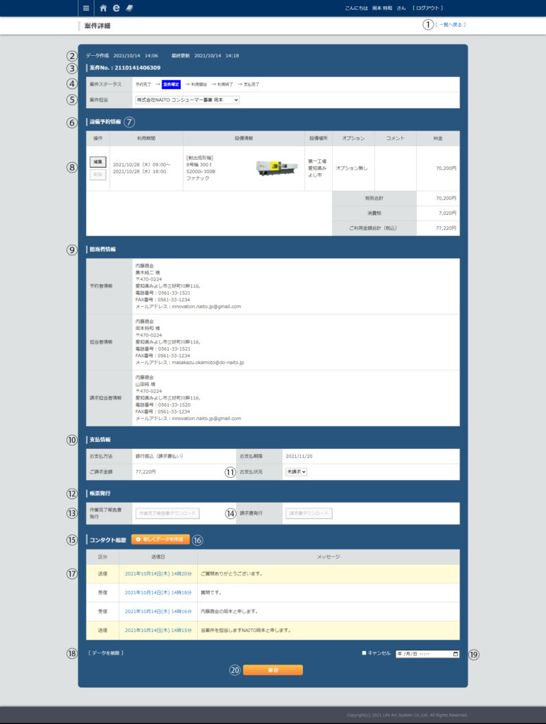 担当者情報 予約者情報、担当者情報、請求担当者情報を表示しています。
