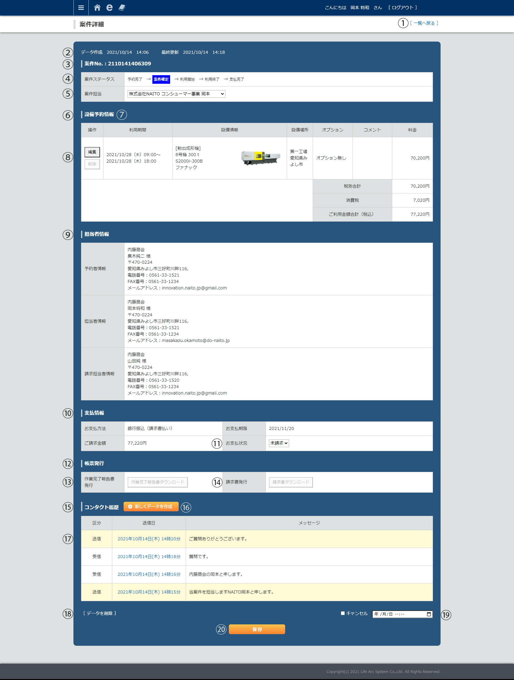 担当者情報 予約者情報、担当者情報、請求担当者情報を表示しています。