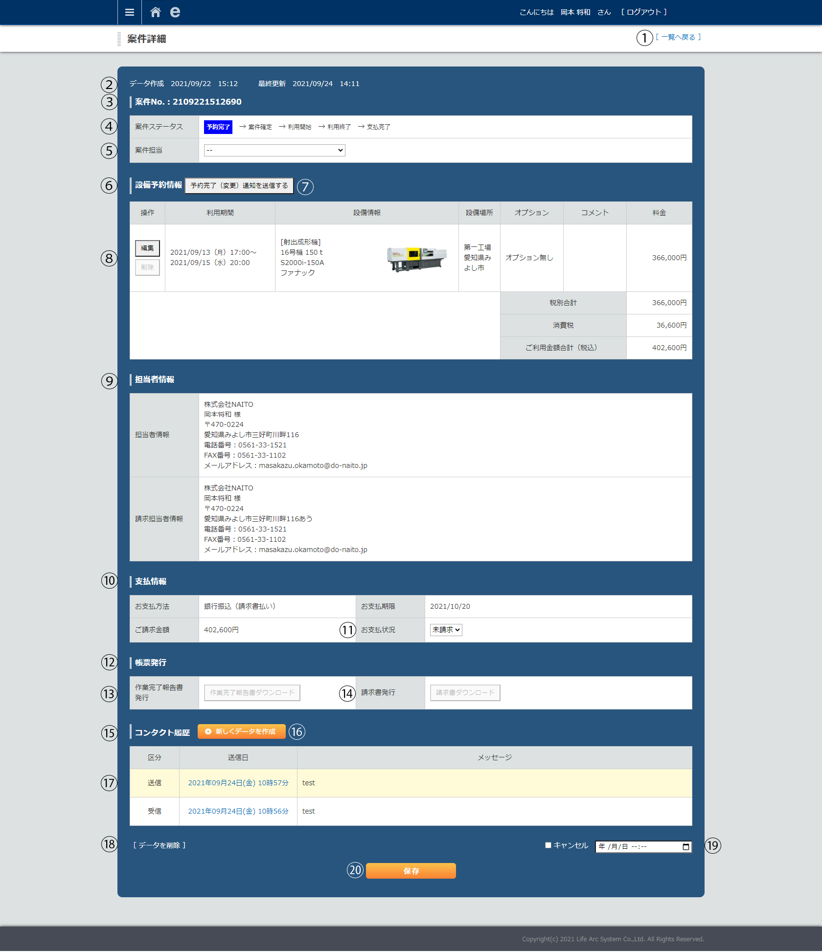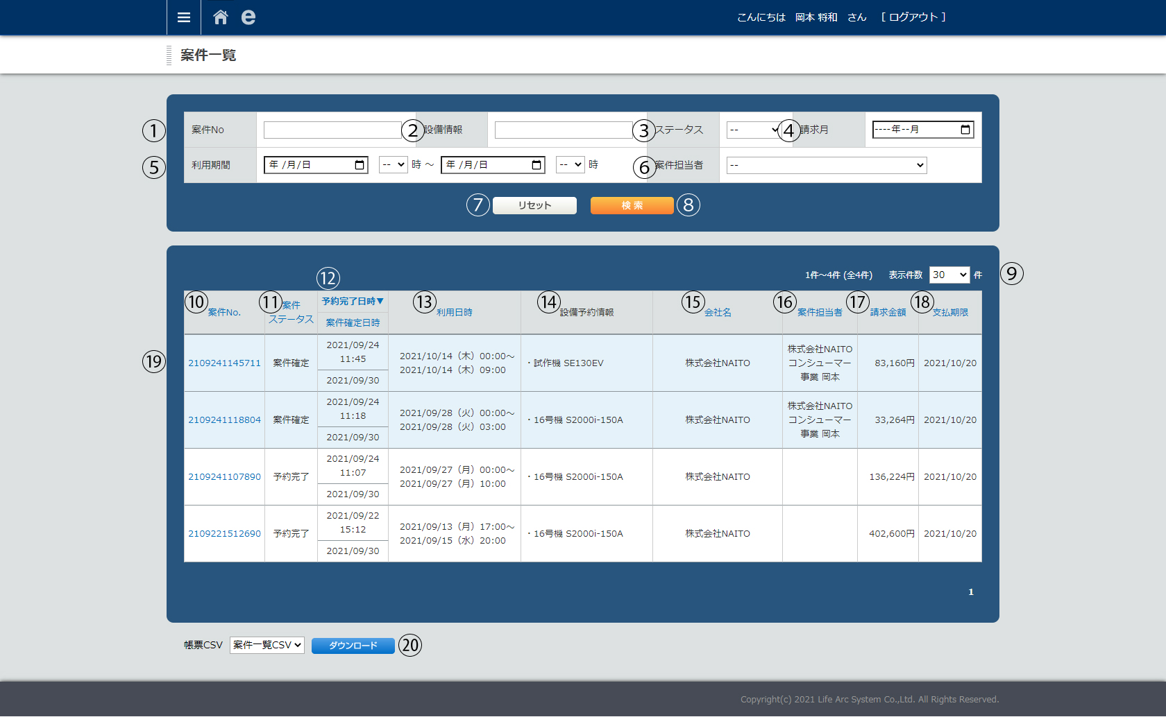 | ⑮ | 会員名 | 案件を予約した会員名(会社名)を表示しています。 クリックで五十音順に降順/昇順します。 |